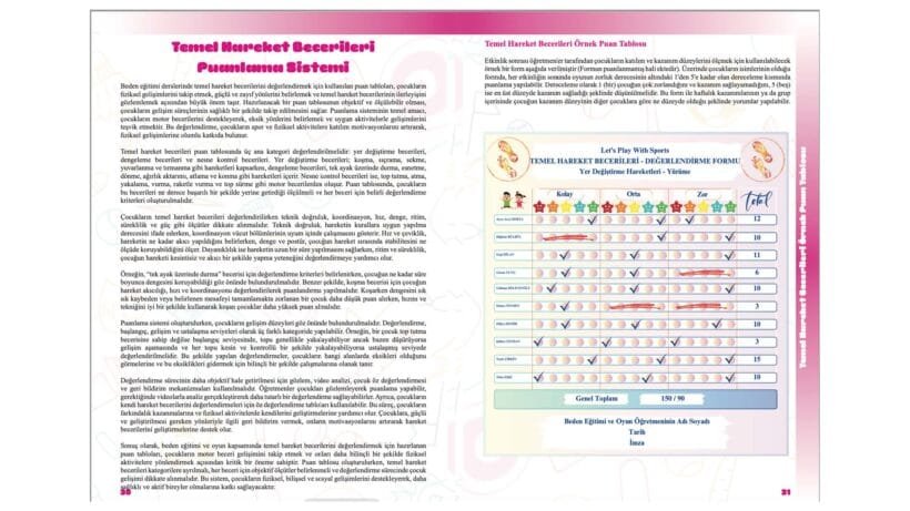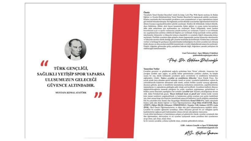 Oyunlarla Temel Hareket Becerileri’ isimli bu kitap; Let’s Play With Sports mottosu ile Beden Eğitimi ve Oyunla Bütünleştirilmiş Temel Hareket Becerileri’ni kapsayacak şekilde yazılmıştır.Kitabın yazımında okul öncesindeki çocukların oyun oynamalarının ve spor yapmalarının önemi göz önünde bulundurulmuştur. Bu bağlamda yazılan etkinlik/oyun kartları öğretmenlerin belirli bir dönem boyunca uygulayabilecekleri şekilde yazılmıştır. Kitabın ilk bölümünde; fiziksel etkinlik, duyu bütünleme, dikkat, okul öncesi kazanımlar, beden eğitimi ve oyunu içeren kavramların daha rahat anlaşılması için açıklamalara yer verilmiştir. İkinci bölümünde; temel hareket becerilerinin oyun ve sporla verilmesine yönelik kartlara yer verilmiştir. Üçüncü ve son bölümde ise; uygulamacılara yardımcı olabilecek bilgilere yer verilmiştir. Kitap içerisinde verilen şarkılar, tekerlemeler, bilmeceler ve hikayeler kolayca ulaşılabilir ve oyunlarla ilişkili olmasından dolayı seçilmiştir. Özellikle oyunların daha anlaşılır olması kapsamında yazılan bilmeceler tekerlemeler ve hikayeler anonim olarak alındığı gibi yazarlar tarafından da üretilmiştir. Kitabın bazı yerlerinde verilen ve herhangi bir gerekçeye dayandırılmadan kullandığımız bu sözler çocuklar için olmayıp kitabı okuyan siz okuyuculara çeşitlilik kazandırmak ve sizleri düşündürmek amacıyla yazılmıştır. Eleştiri; doğruları görmezden gelip yanlışlara bakmak değil, doğruların yanında yanlışların da olabileceğini kabullenmektirKitapla ilgili bilgiler eklerde verilmiştir